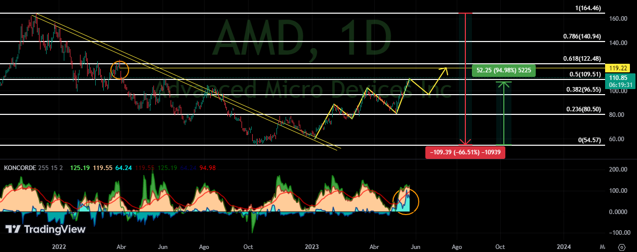 Actualmente lleva un 94% desde los mínimos registrados en octubre de 2022. Recientemente, podemos ver con el indicador de Koncorde, que han entrado las manos fuertes a realizar compras de acciones de AMD. Como os he señalado en el gráfico, podemos ver una curiosa estructura que parece repetirse cada vez que el precio perfora un nuevo nivel de fibos hasta en tres ocasiones, lo que nos indica que podríamos ver una corrección que nos permita entrar a un mejor precio en AMD antes de seguir el movimiento al alza. Como punto a destacar, tenemos un gap pendiente de cierre situado en los 119 dólares, algo que también nos fortalece la tesis de una continuación de la tendencia.
