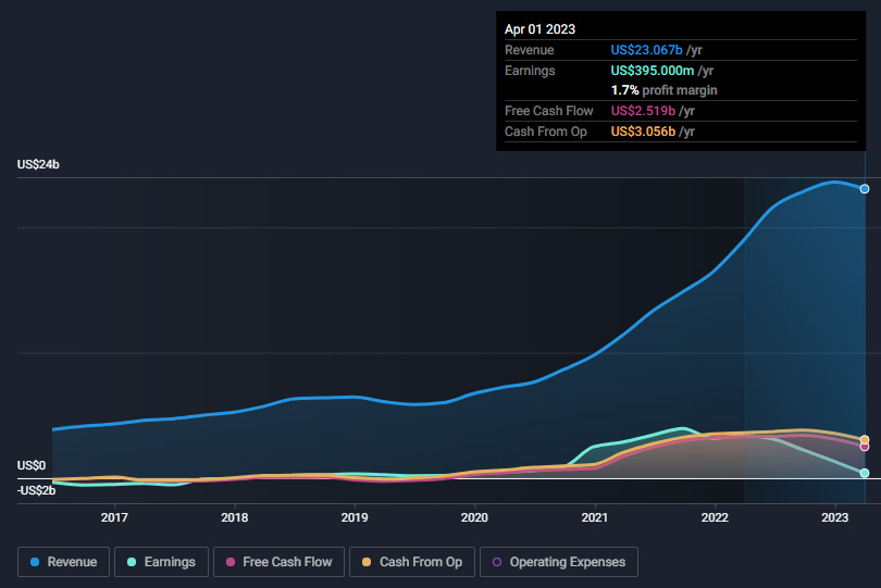 Los beneficios de AMD han crecido significativamente en un 40,5 % por año durante los últimos 5 años. En parte se debe a la crisis de los semiconductores que beneficios a este sector en gran medida. Aun así, desde el inicio del año 2022 presenciamos una caída de los mismos, como hemos comentado en el párrafo de la situación de AMD.