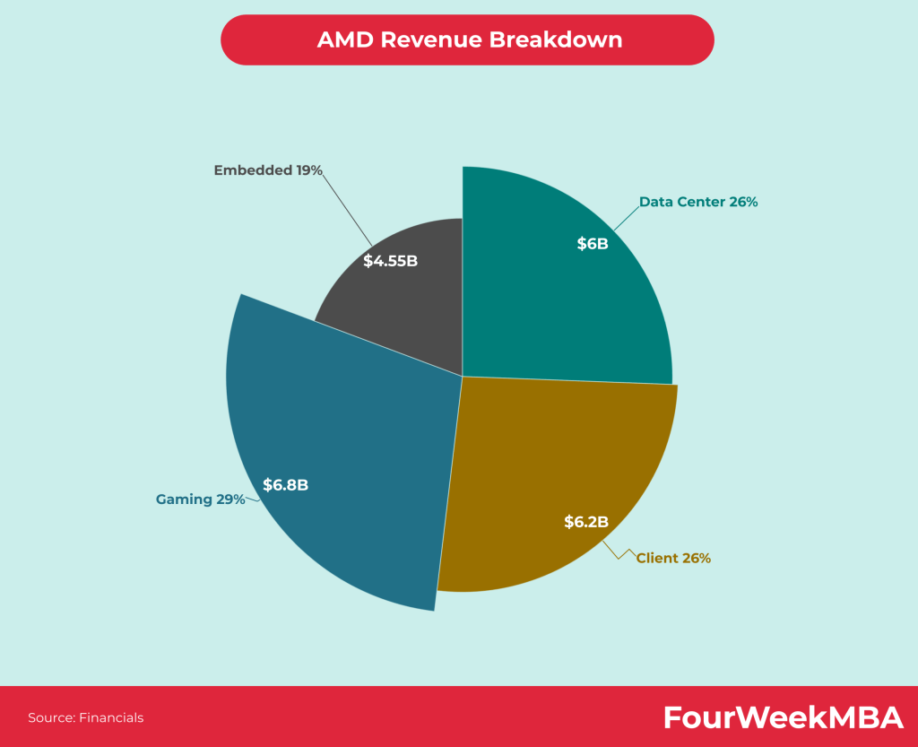 Advanced Micro Devices, Inc. opera como una empresa de semiconductores en todo el mundo. Opera en cuatro segmentos: Data Center, Client, Gaming y Embedded. La empresa ofrece microprocesadores x86 y unidades de procesamiento de gráficos (GPU) como unidad de procesamiento acelerado, conjuntos de chips, centros de datos y GPU profesionales; y procesadores integrados, y productos de sistema en chip (SoC) semipersonalizados, servicios y tecnología de desarrollo de microprocesadores y SoC, unidades de procesamiento de datos, arreglos de compuertas programables en campo (FPGA) y productos SoC adaptativos.