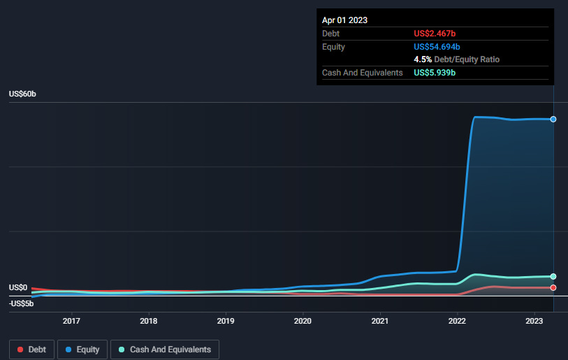 AMD tiene un capital total por valor de $54,700 millones y una deuda total de $2,500 millones, lo que eleva su índice de deuda a capital a 4,5%. Podemos destacar que la relación deuda/capital de AMD se ha reducido del 193,6 % al 4,5 % en los últimos 5 años y que la deuda está bien cubierta por el flujo de caja operativo (123,9%). Tiene efectivo e inversiones a corto plazo de $5,900 millones.