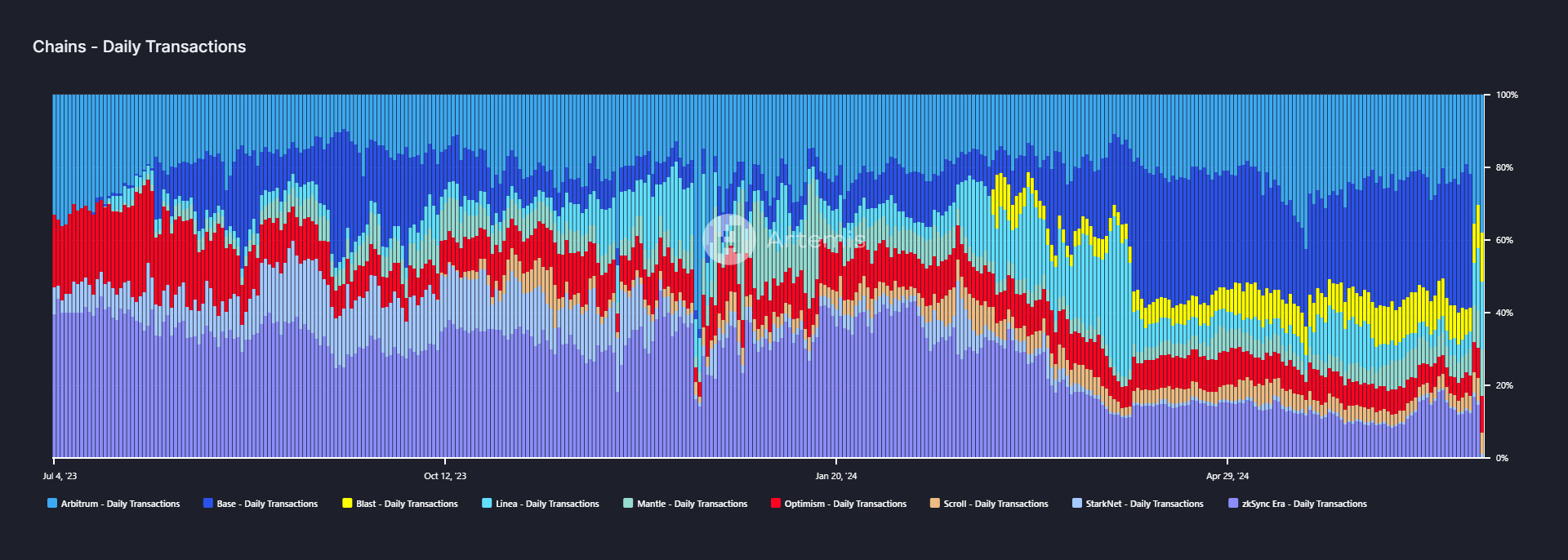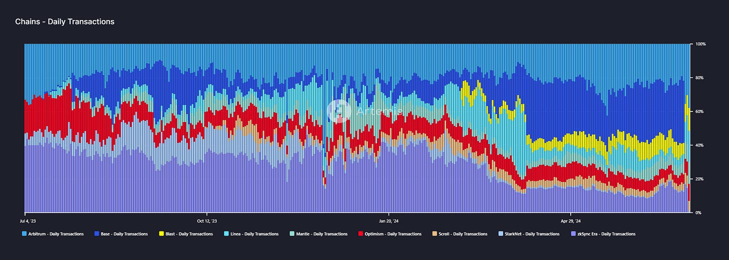 Arbitrum y Base también representan el 59% del volumen de transacciones en 23 soluciones de escalado de Ethereum. Base lidera el grupo con 3.160 millones de dólares. Base lidera el grupo con 3,16 millones de transacciones en 24 horas o un dominio del 36,8%, seguida de Arbitrum con 1,99 millones de transacciones o una cuota de mercado del 22,2%. Blast ocupa el tercer lugar, con 605.000 transacciones (8% del total).